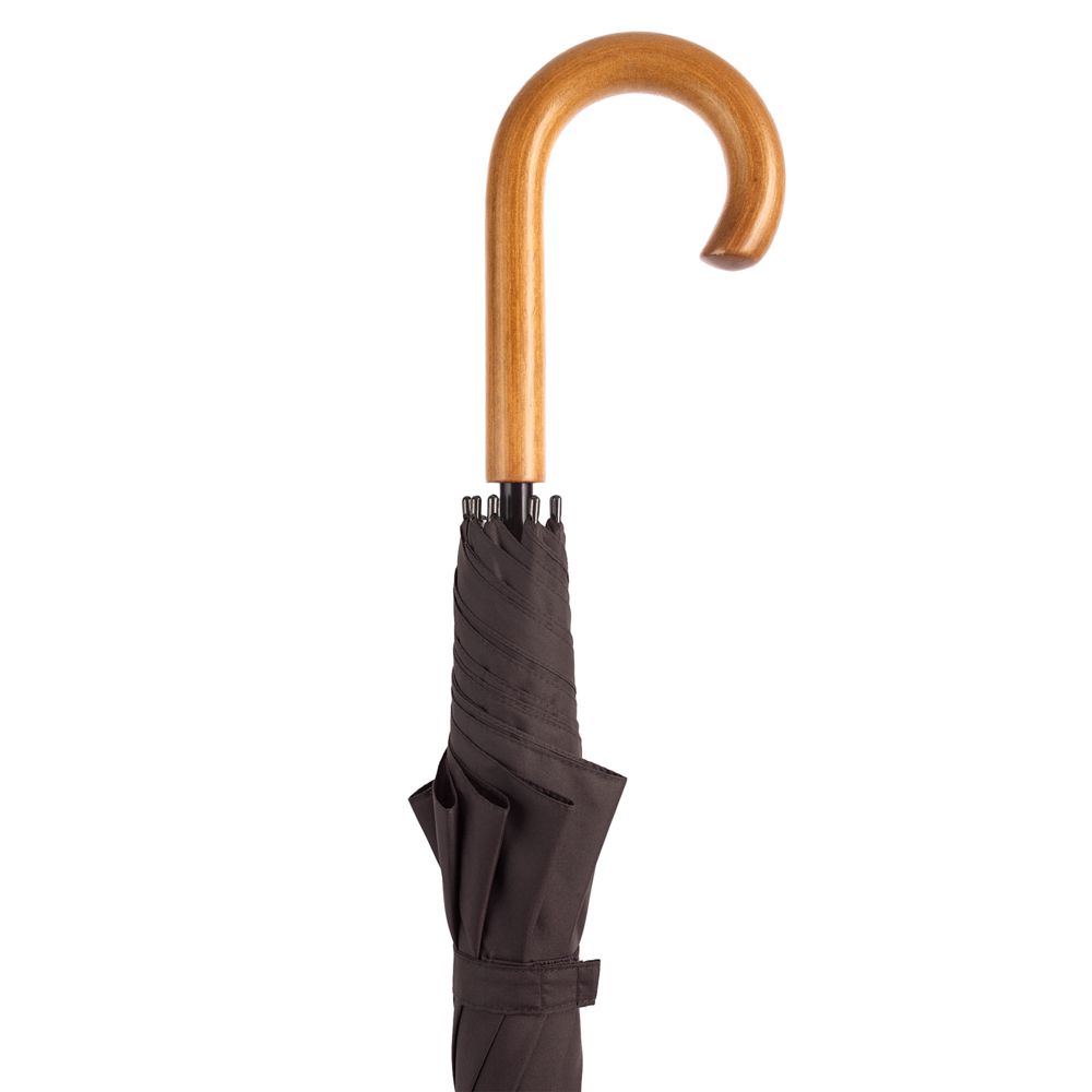 Элегантный зонт с большим куполом и деревянной J-образной ручкой.