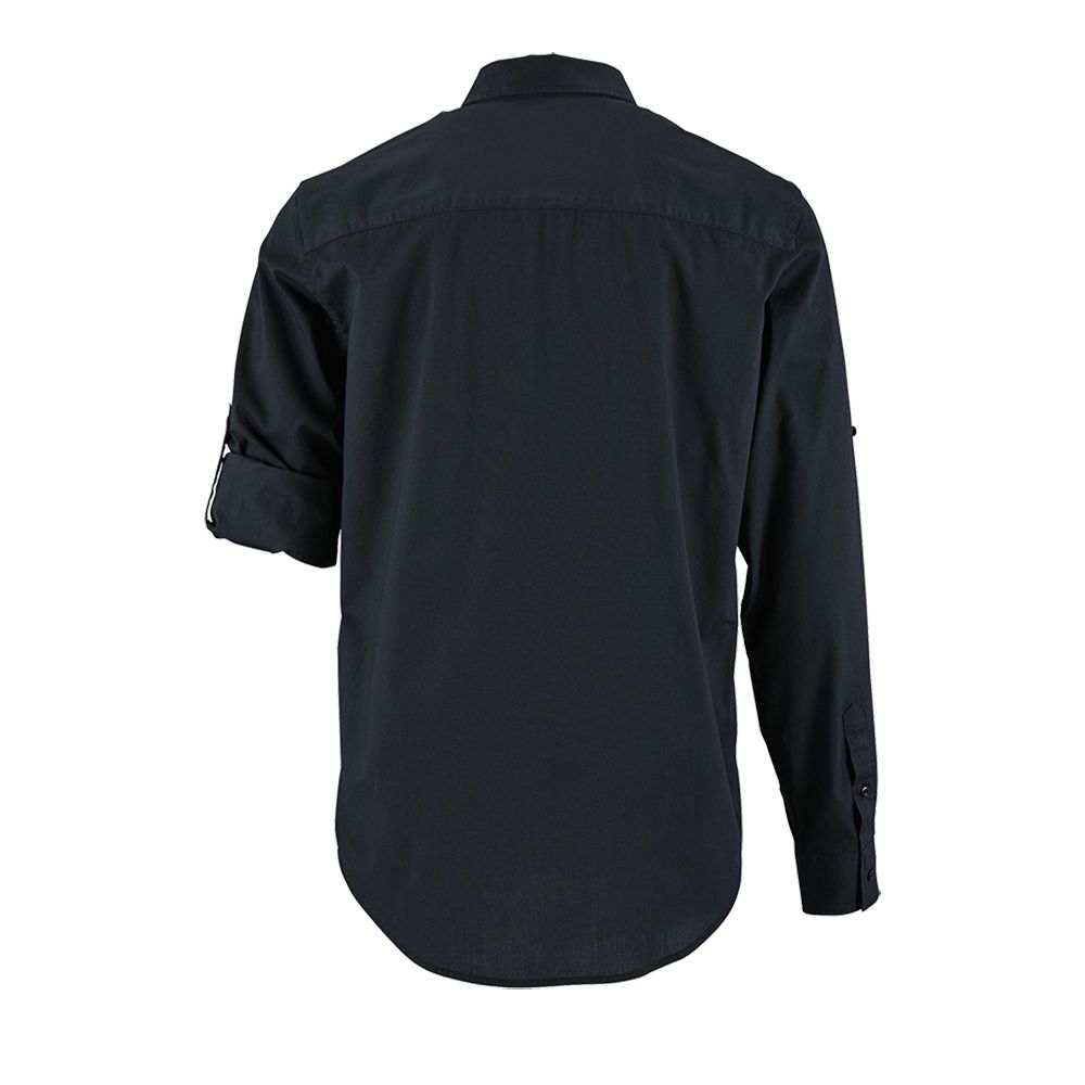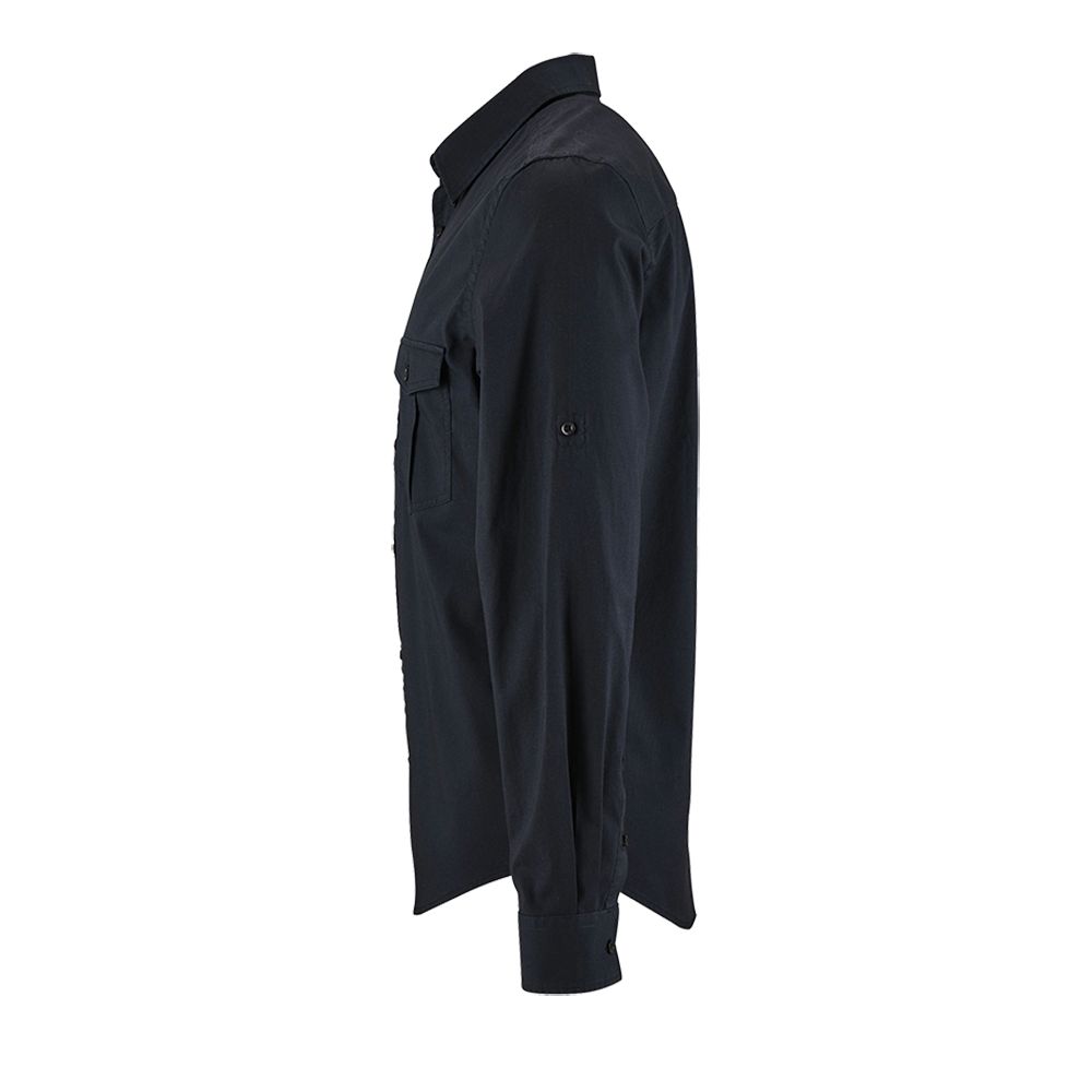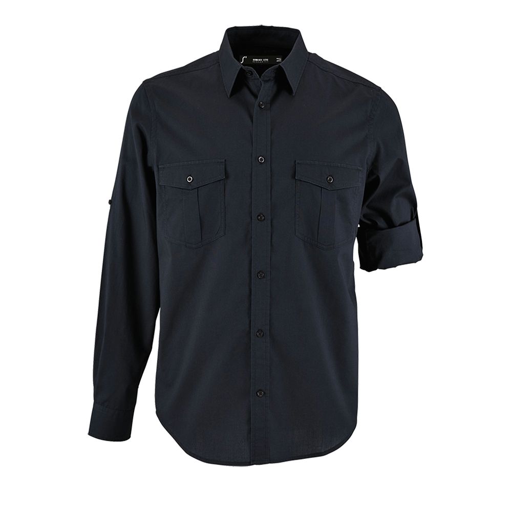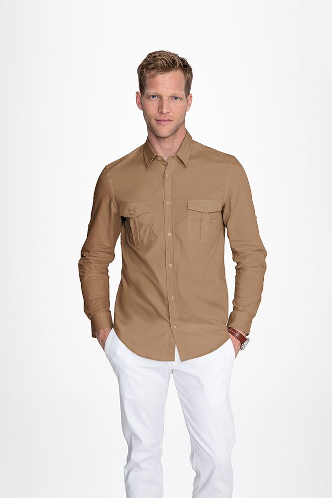 Рубашка прямого кроя в стиле «сафари» с планкой на 7 пуговиц в тон и манжетами на 1 пуговице.Накладные карманы с клапанами на пуговицах на груди.Длина рукава регулируется.