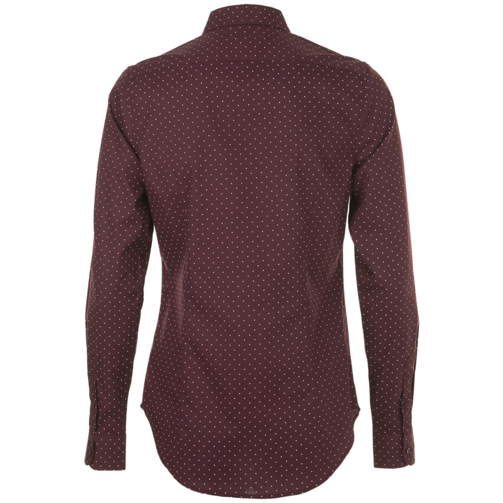 Модная рубашка с печатным рисунком в горошек, которая прекрасно впишется в современный корпоративный стиль.Приталенная модель с нагрудными вытачками, маленьким классическим воротничком, планкой с 7 пуговицами тон в тон и манжетами на 1 пуговице с разрезом «капуцин».