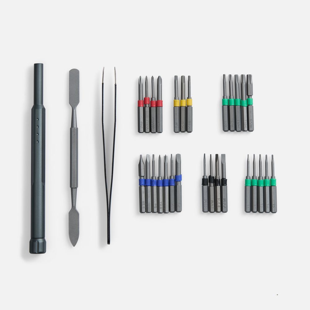 В набор бит для точных работ входят насадки, необходимые для ремонта смартфонов, планшетов, ноутбуков и ПК, включая iPhone, iPad, MacBook Air и MacBook Pro, а также игровые консоли и контроллеры от Nintendo, PlayStation или XBox. Входящий в набор пинцет позволяет более уверенно манипулировать деталями электроники, а спуджер позволяет без особых усилий вскрыть клавиатуру ноутбука или подцепить глубоко расположенную батарейку.В комплекте магнитный держатель, пинцет, лопатка-спуджер и 28 бит:
