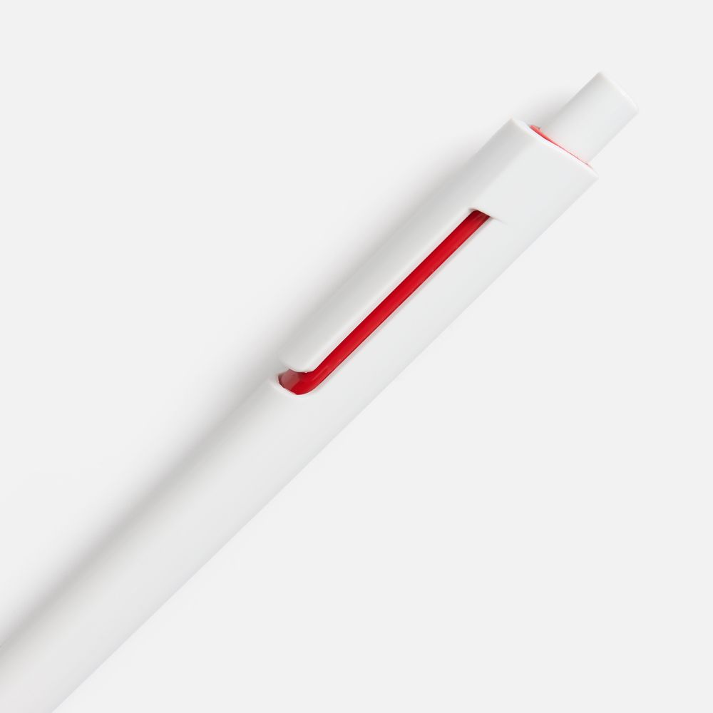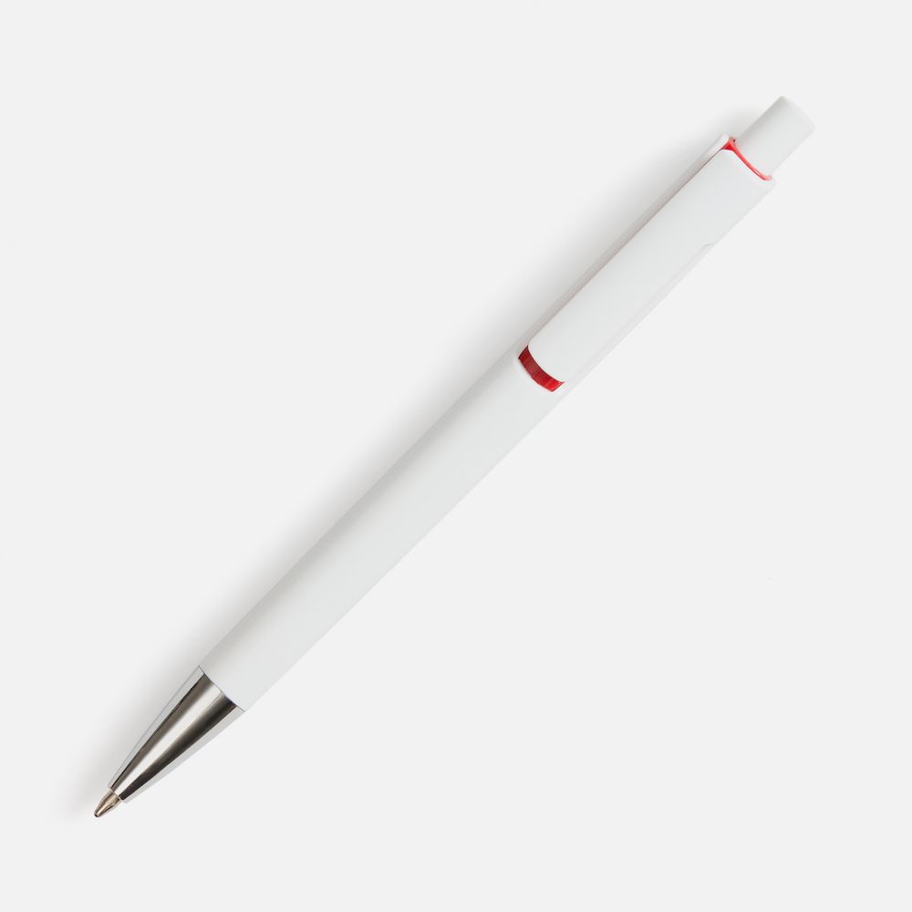 Шариковая ручка с глянцевым белым корпусом и цветовым акцентом у клипа, который дополнит логотип компании.