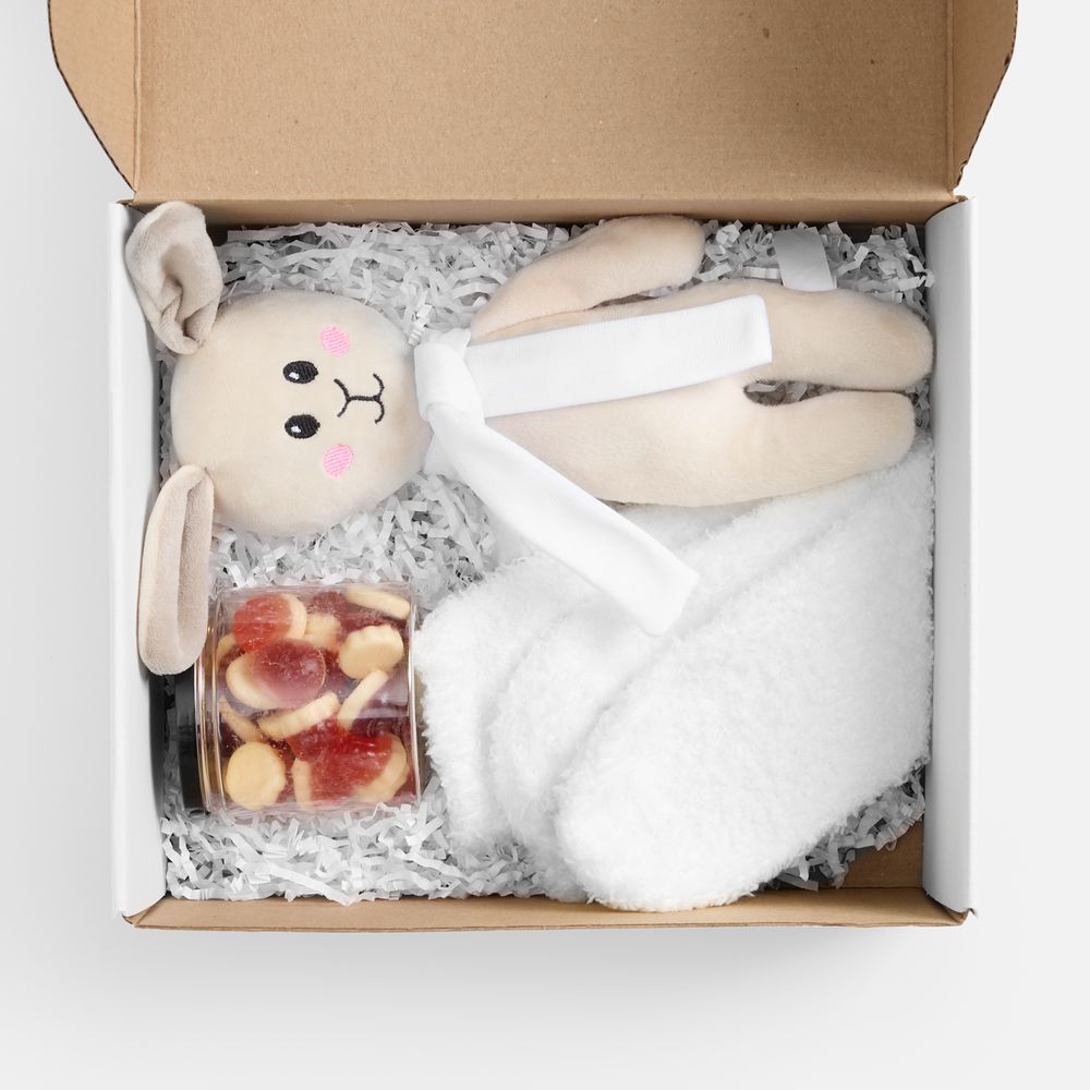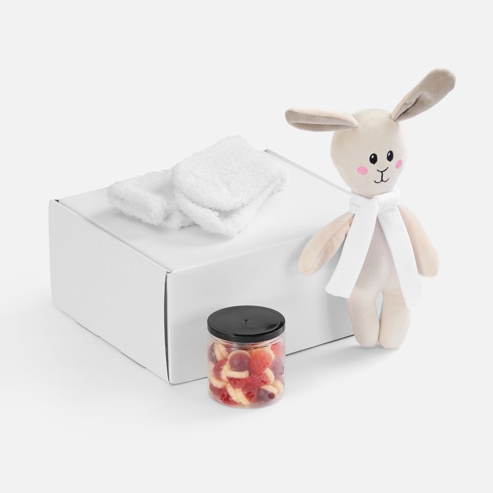 Порой так приятно снова почувствовать себя ненадолго ребенком — ощутить ту особенную безмятежность и способность радоваться приятным мелочам. А может, поделиться этой чудесной беззаботностью с другими — как с детьми, так и с такими же взрослыми.Белые носки, милый плюшевый заяц и мармелад с нежным вкусом — сочетание, перед которым будет трудно устоять любому. Зайчик с трогательными ушами непременно вызовет улыбку, а его симпатичный шарф станет еще более стильной деталью и главным акцентом всего набора после персонализации. Kidult. Детство всегда рядом.