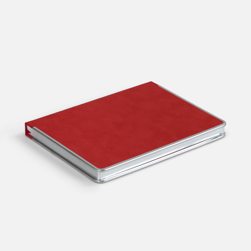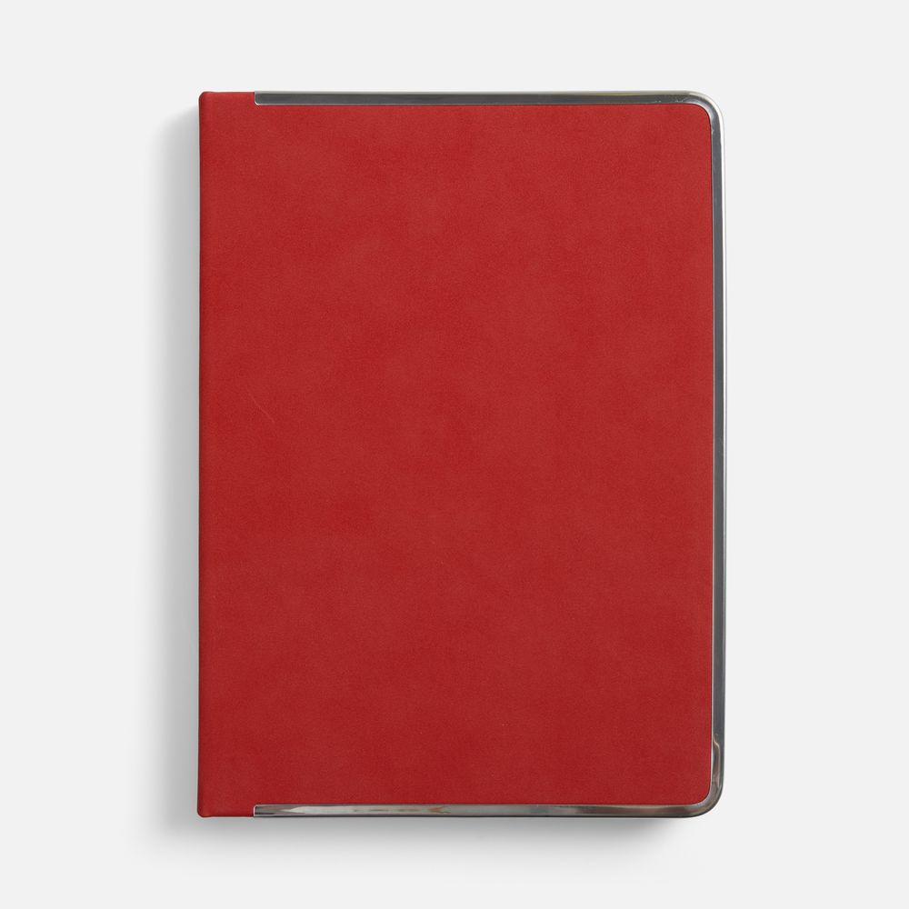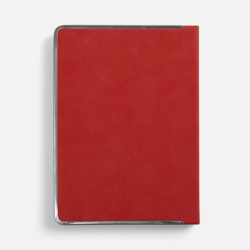 Ежедневник с твердой обложкой и серебристым обрезом блока. Выполнен из материала Nubuck, красный РР, дополнен красным ляссе и металлическими рамками с двух сторон обложки.Блок 256: