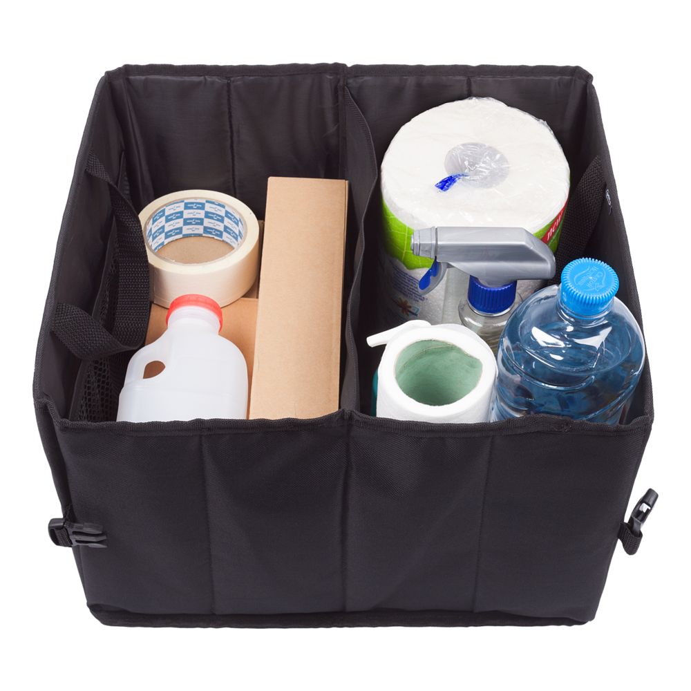 Органайзер с двумя отсеками, внутренним карманом и петельками для крепления мелочей. В нем легко разместить необходимые автомобилисту инструменты и аксессуары.Объем: 28 литров.