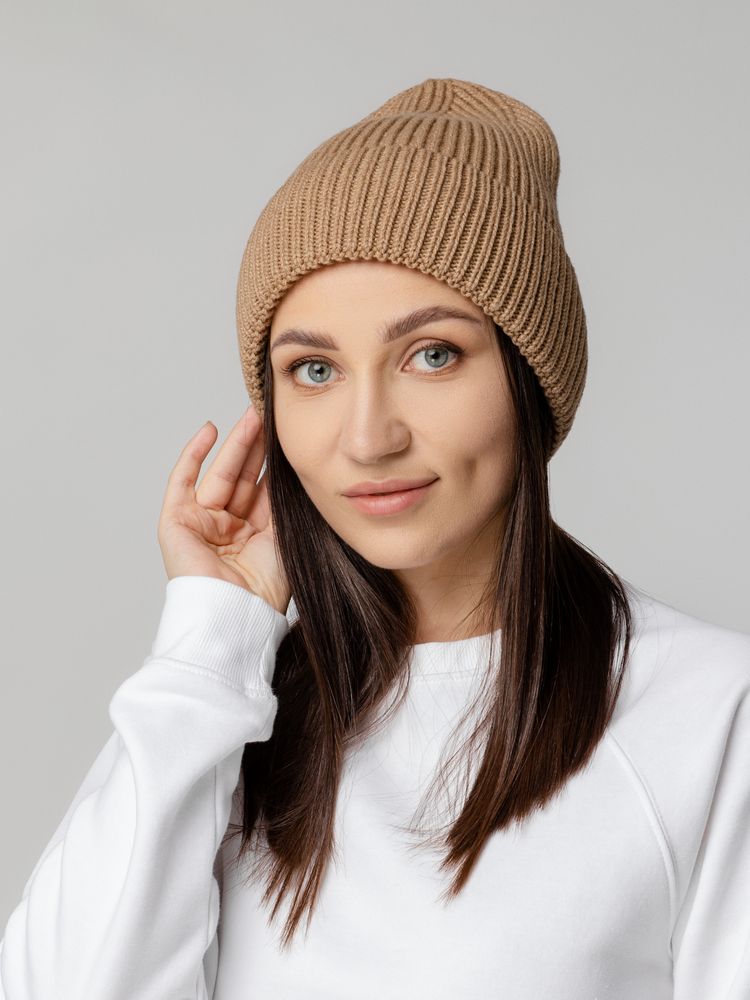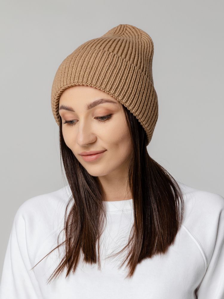 Шапка-бини из полушерстяной пряжи актуальных приглушенных оттенков. Трендовый фасон с удлиненным верхом — для расслабленного повседневного образа.Однослойная шапка рельефной вязки с отворотом.Модель унисекс.Поставляется в пакете с липким краем.
