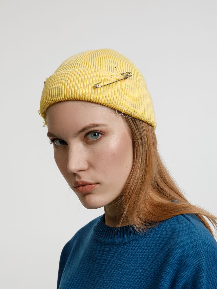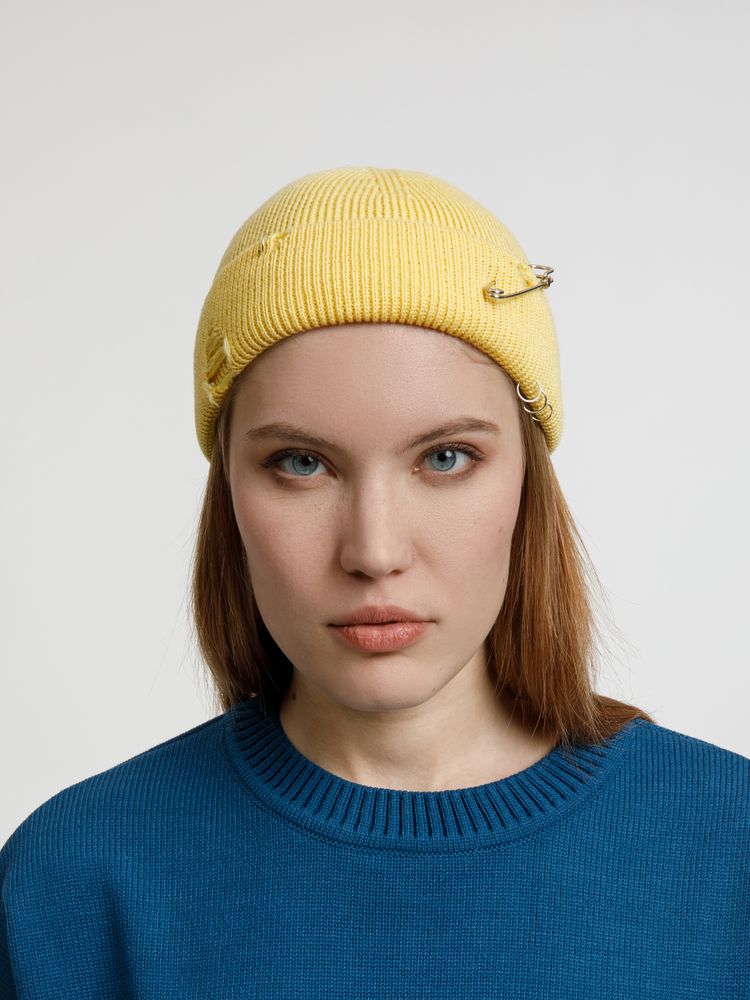 Однослойная шапка бини с рваным отворотом и металлическими аксессуарами для дерзких образов в любом возрасте. Яркий и запоминающийся акцент в стиле гранж.Поставляется в пакете с липким краем.
