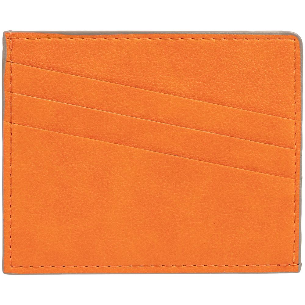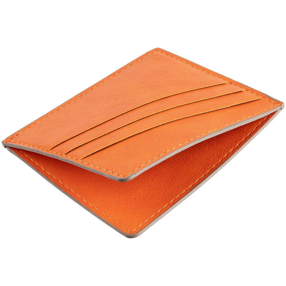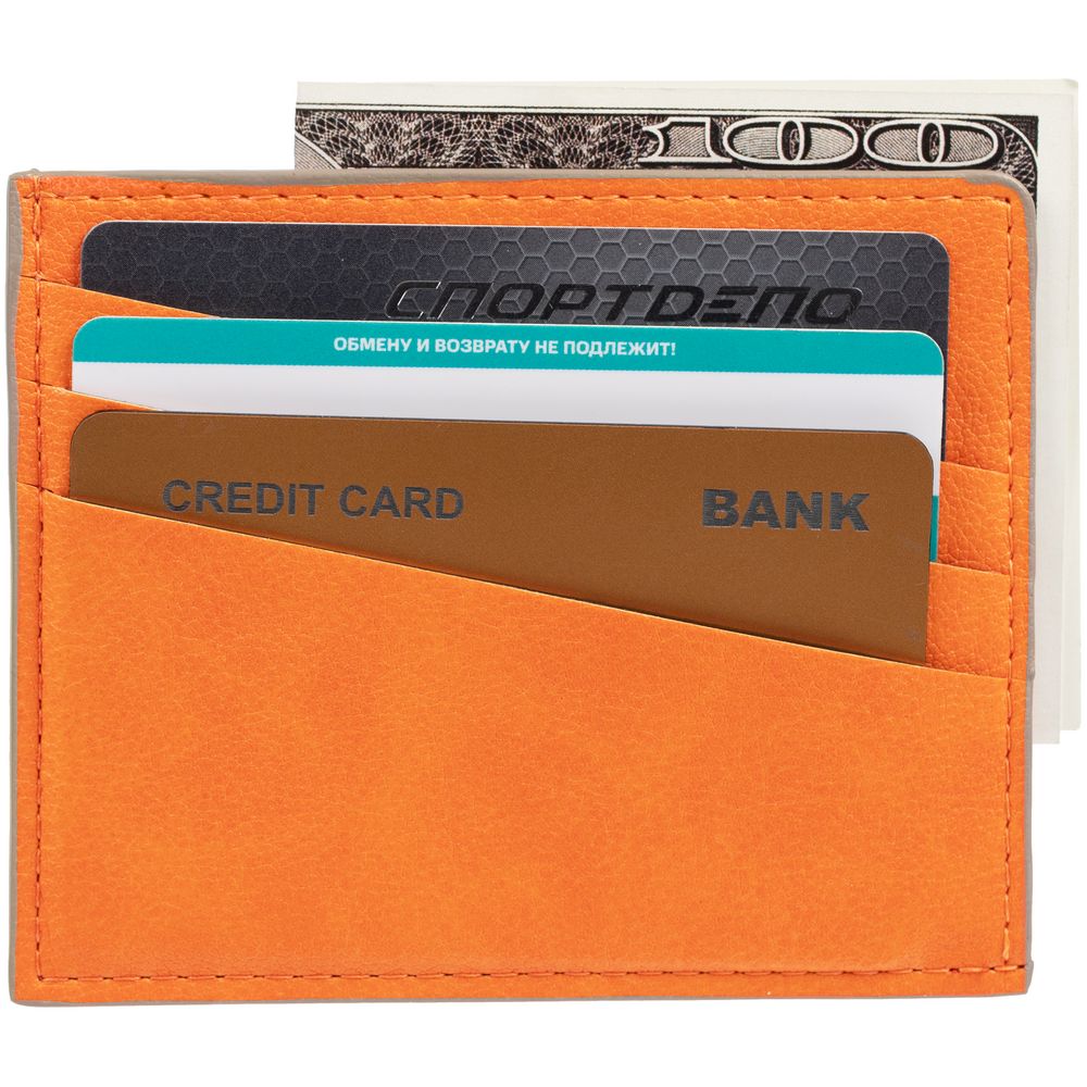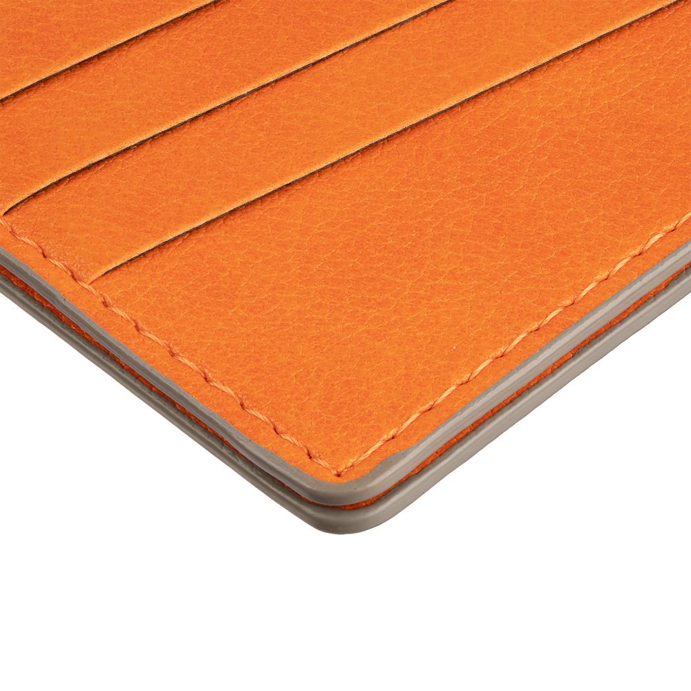 Чехол выполнен из материала Petrus, оранжевый ОО, дополнен окрашенным срезом края и внутренним карманом из серого картона. Имеет 4 отделения для кредитных карт и 1 отделение для купюр.