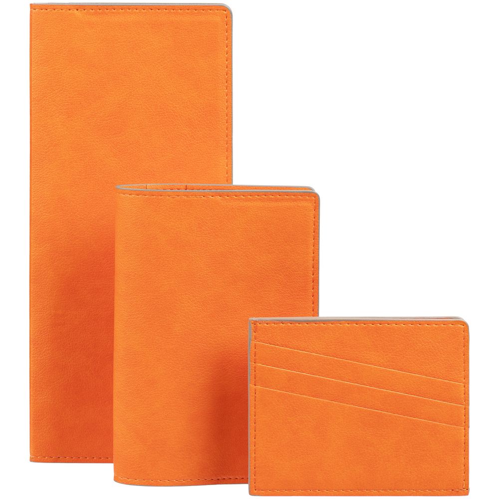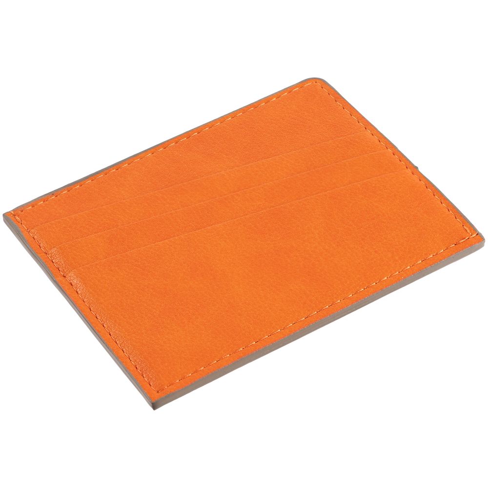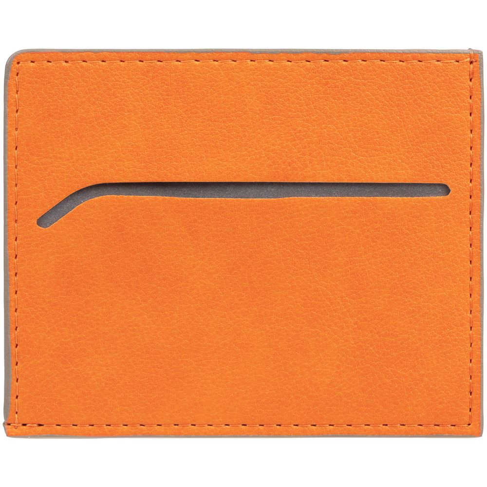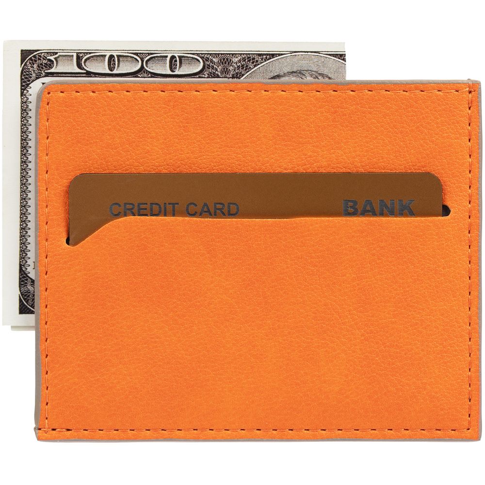 Чехол выполнен из материала Petrus, оранжевый ОО, дополнен окрашенным срезом края и внутренним карманом из серого картона. Имеет 4 отделения для кредитных карт и 1 отделение для купюр.