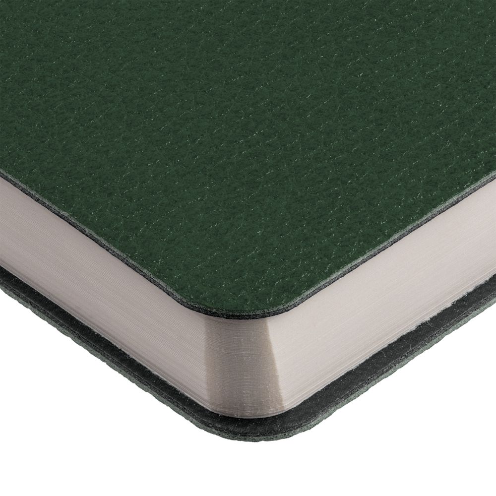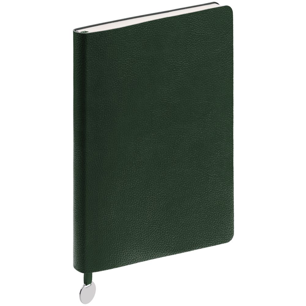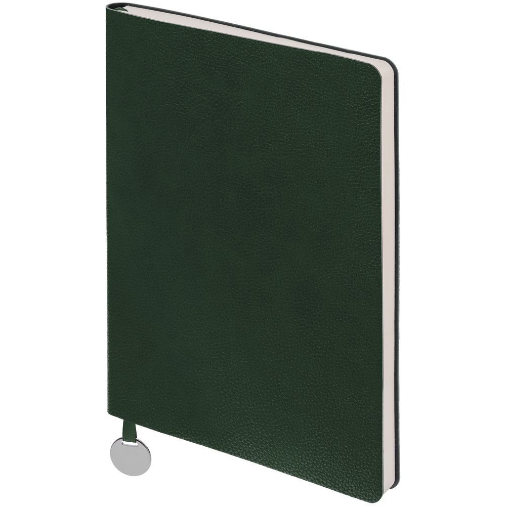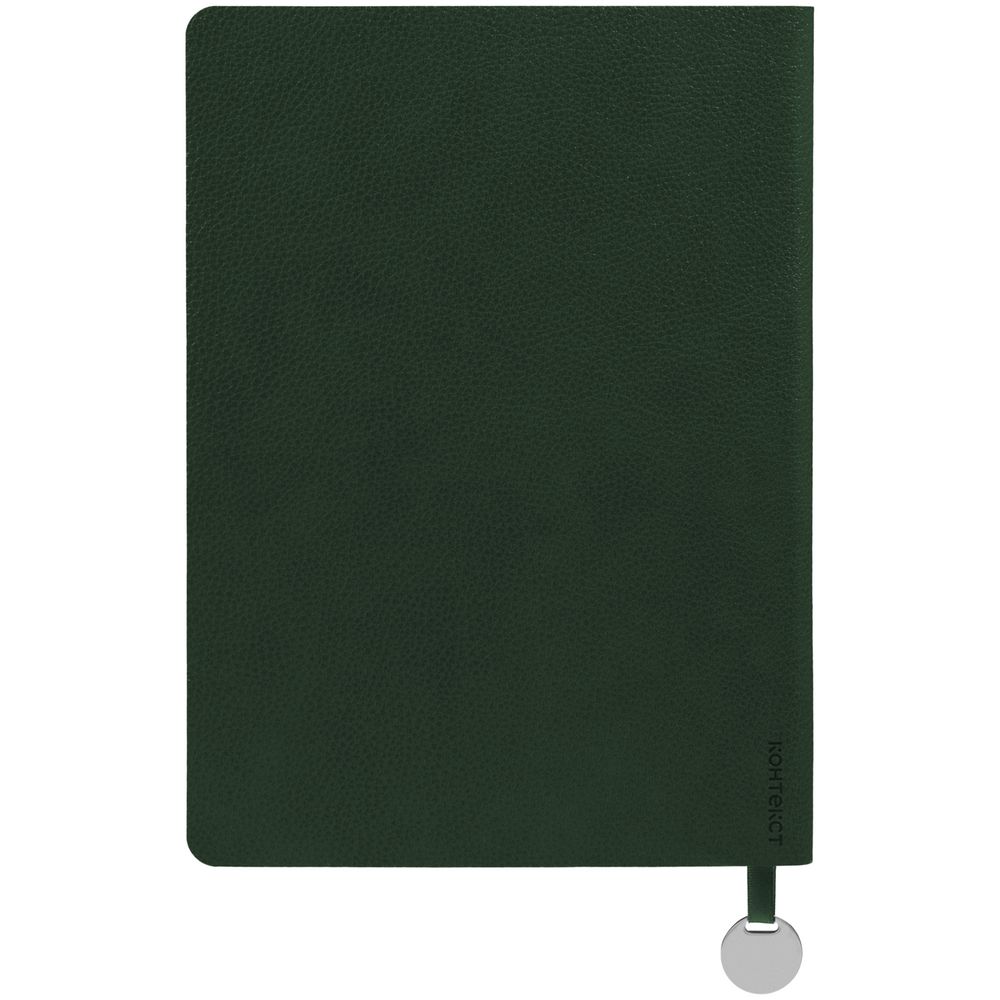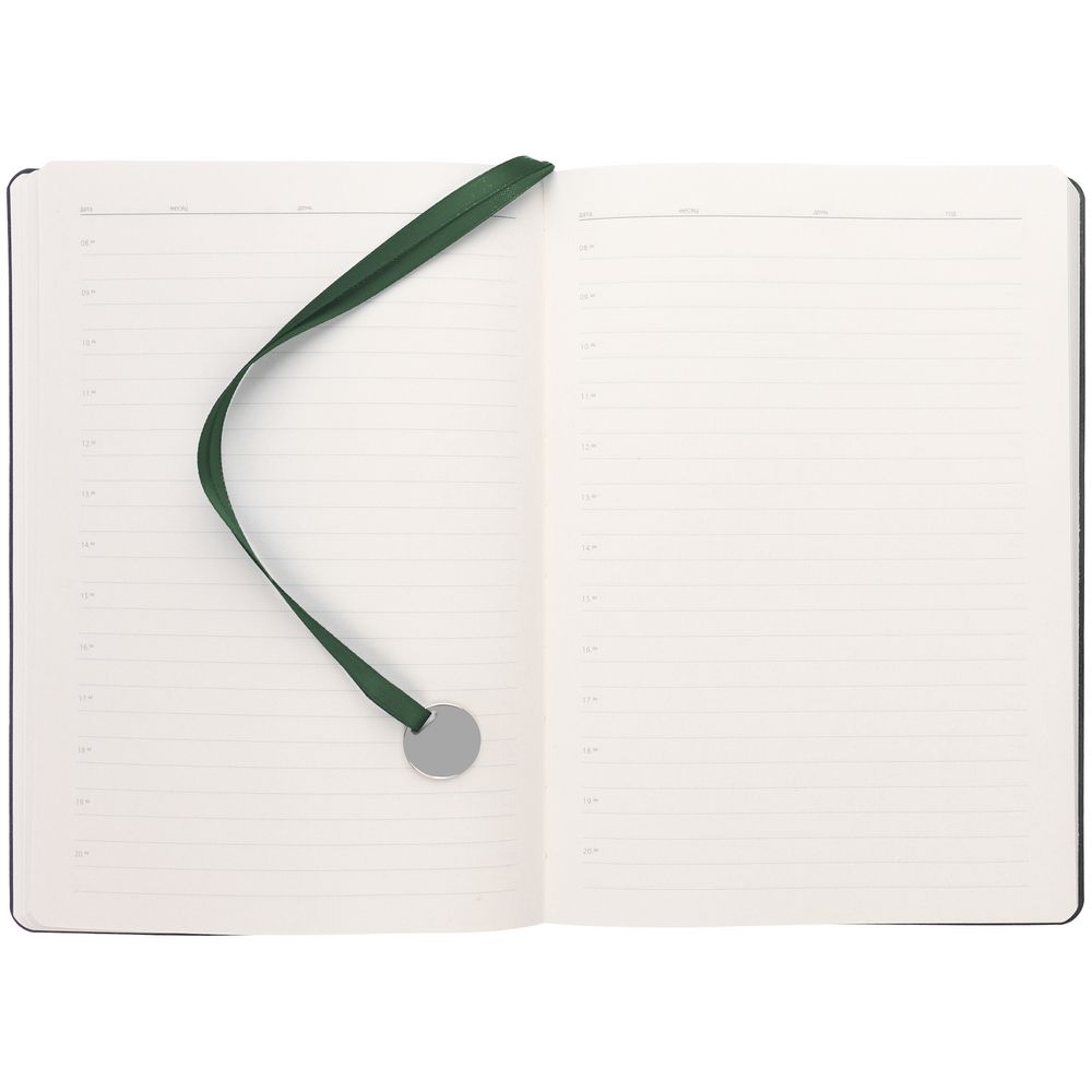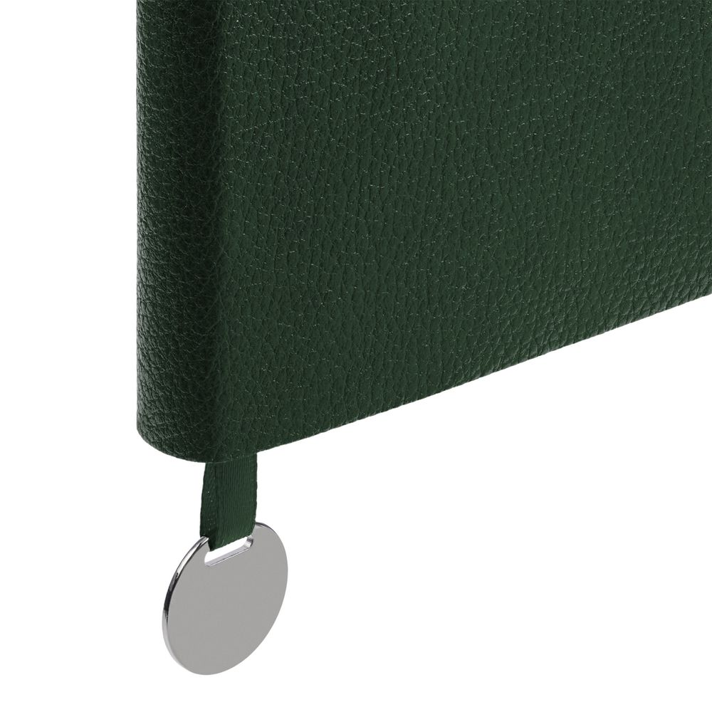 Ежедневник с гибкой обложкой, выполнен из материала La Fite, зеленый, дополнен ляссе в цвет обложки с металлическим шильдом.