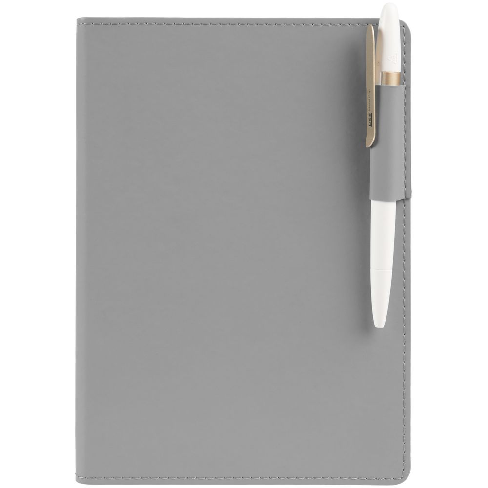Ежедневник с гибкой обложкой из материала Soft Touch, серый СС и Latte, серый (внутренний материал), дополнен петелькой для ручки из покровного материала, капталом, ляссе и закрашенным срезом обложки в цвет материала.