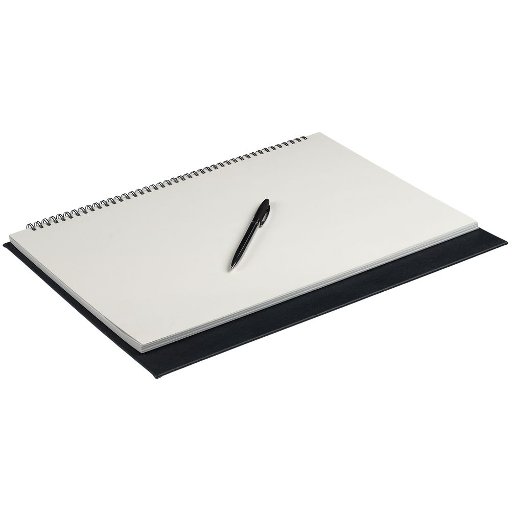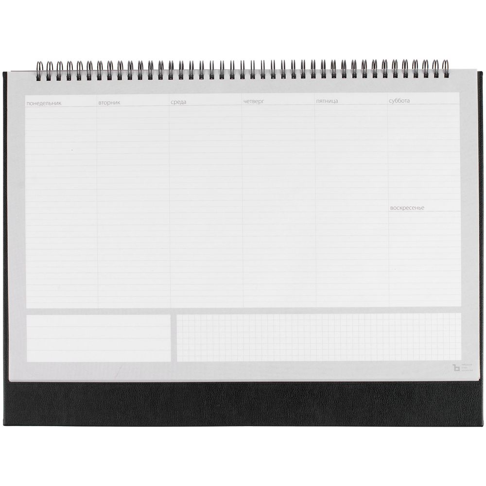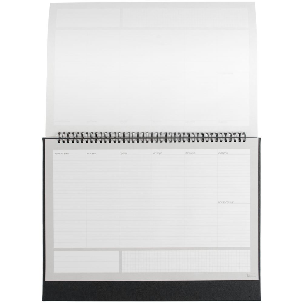 Настольный недатированный планер на открытой пружине. Обложка из белого мелованного картона, подложка из плотного картона в материале Petrus, черный АА.