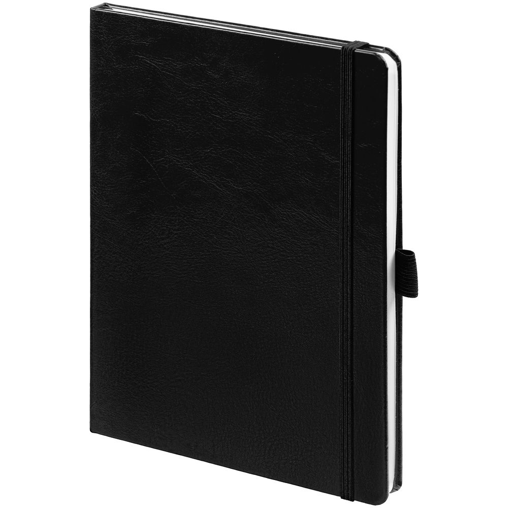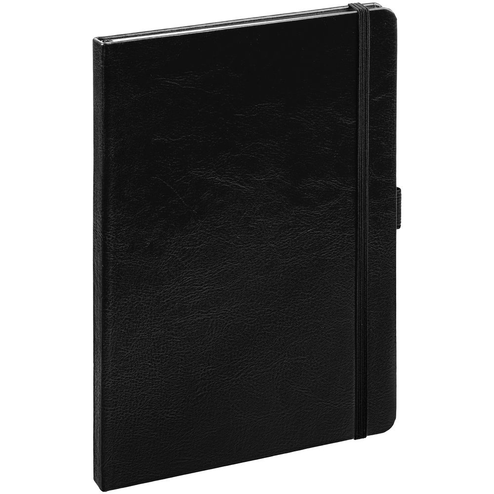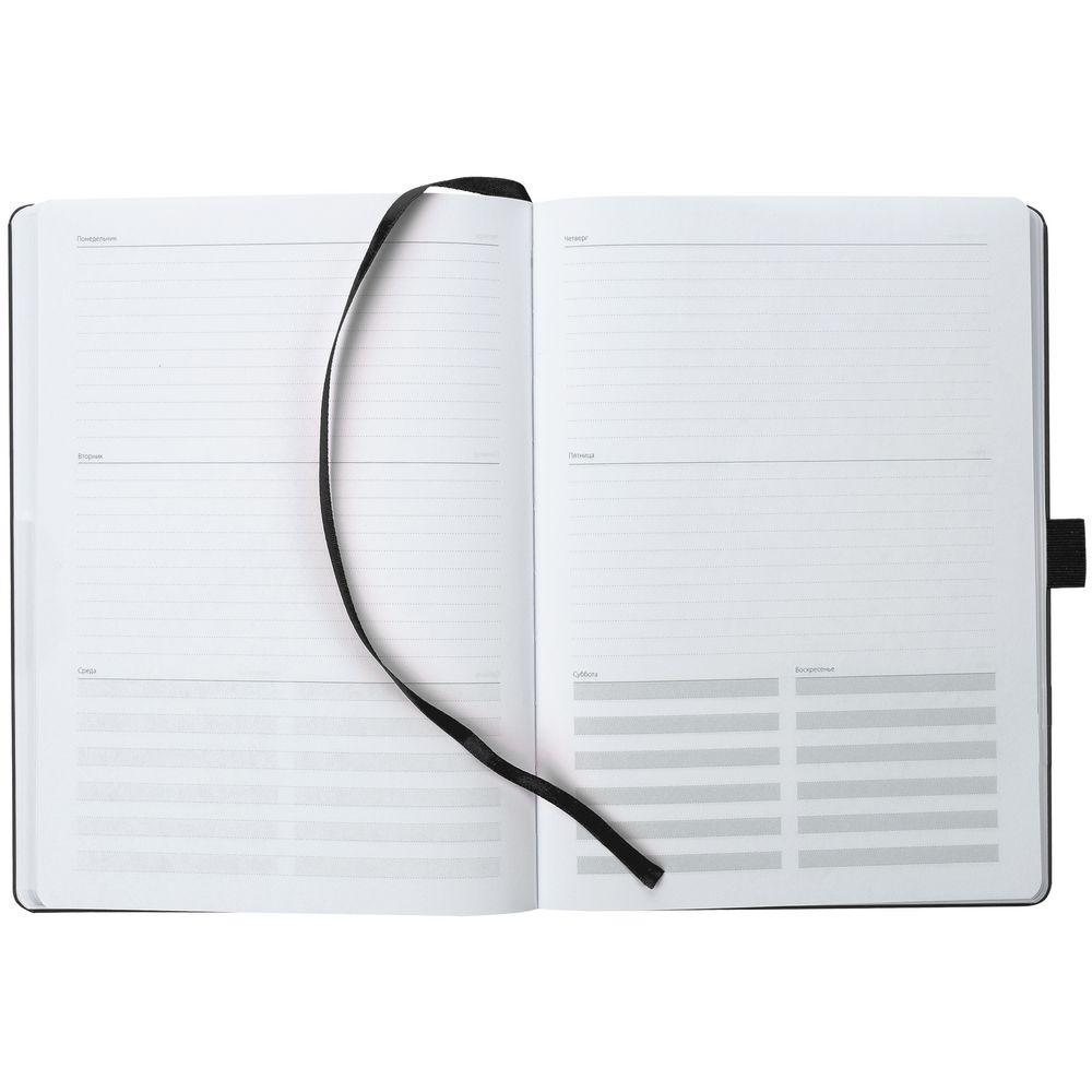 Еженедельник в твердой обложке выполнен из материала Nebraska, черный АА, дополнен резинкой, петлей для ручки и ляссе черного цвета.Блок 201, без информационного блока: