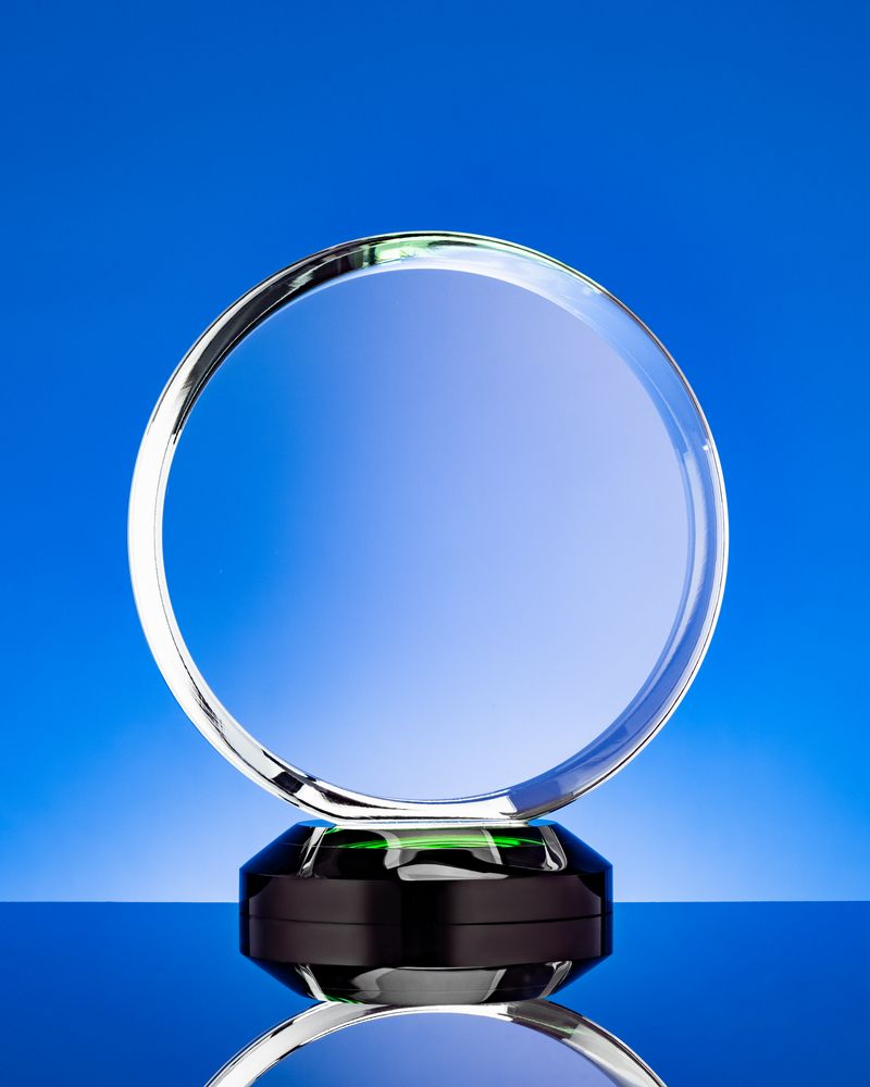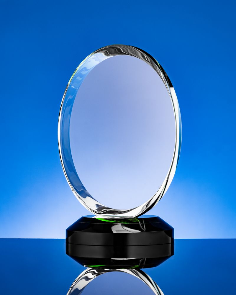 Стела изготовлена из стекла К9, в основе которого лежит оптическое боросиликатное стекло. Эту марку стекла отличает низкий процент посторонних включений, высокий показатель преломления и высокая прозрачность — идеальные качества для изготовления наград премиального уровня.Дополнительный слой зеленого стекла на основании придает всей стеле легкий оттенок.