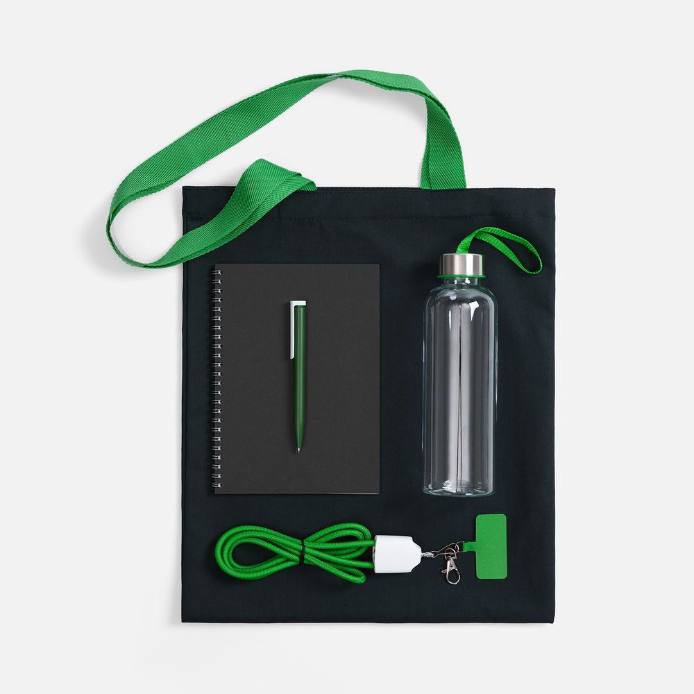 сумка - хлопок, 240 г/м²; ручки - полиэстер; кабель-ланьярд - нейлон, пластик; металл; бутылка - пластик, пищевой; крышка - металл, пластик; блокнот - бумага, картон; ручка - пластик