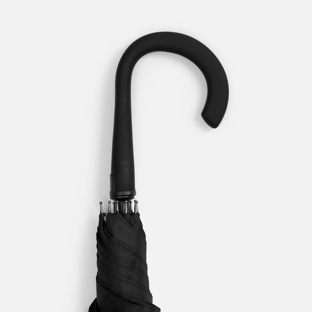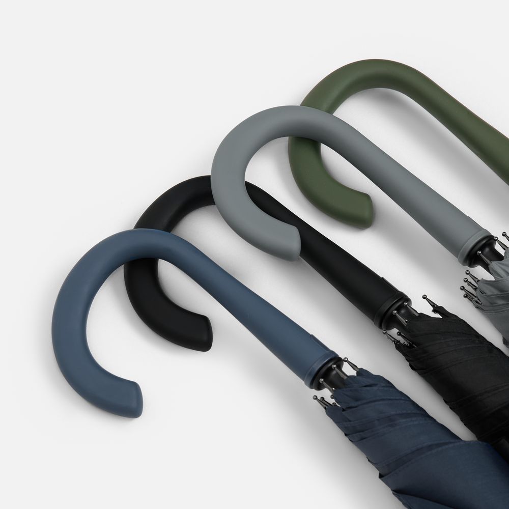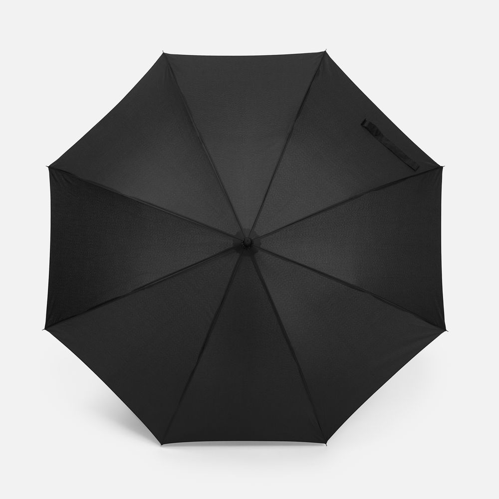 Современная модель зонта-трости с эргономичной ручкой, каркасом из стеклопластика и увеличенным размером купола. Широкий хлястик как дополнительное поле печати поможет в кастомизации.