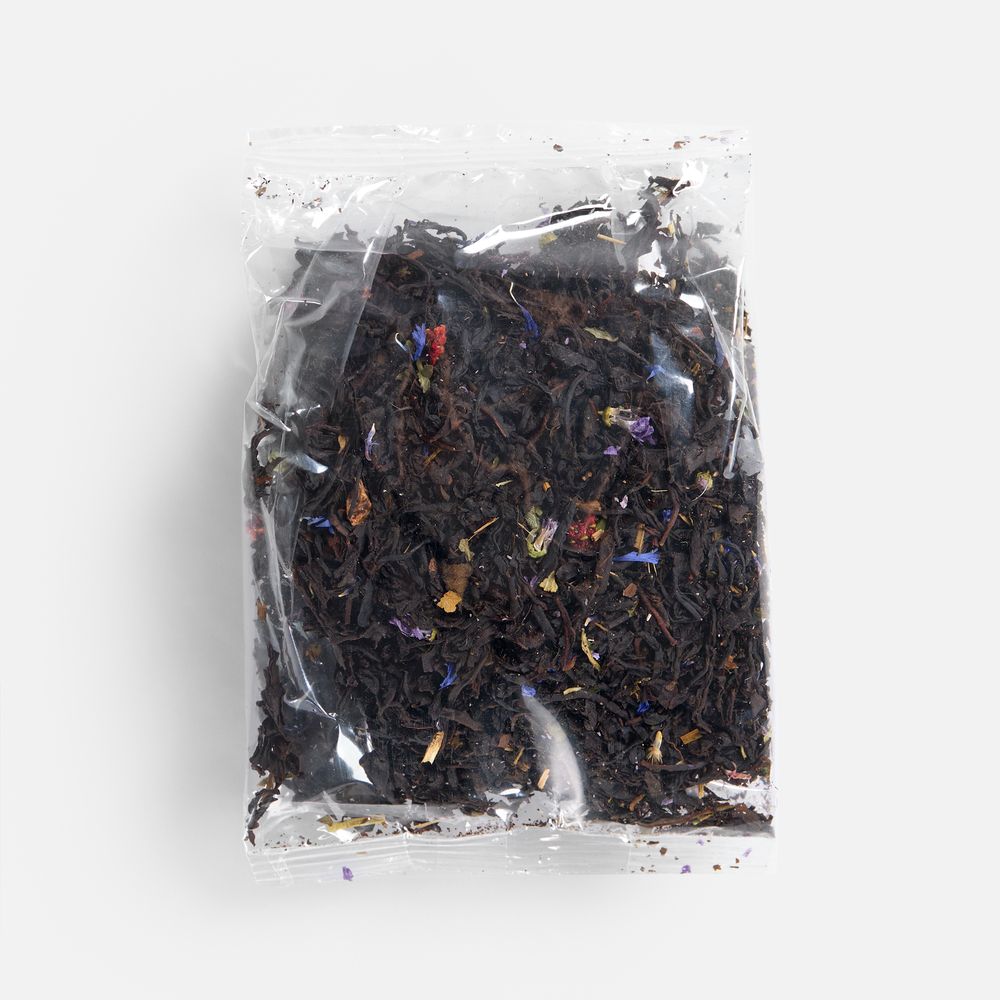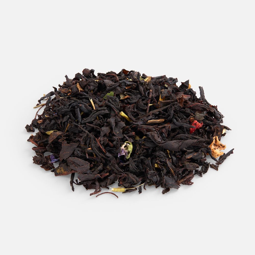 Праздничный купаж на основе черного чая, украшенный цветочными лепестками и кусочками клубники.Состав: черный индийский чай, сушеная клубника, клубничный лист, цветки василька, ароматизатор «клубника».Вес 50 г.Срок годности: 24 месяца.