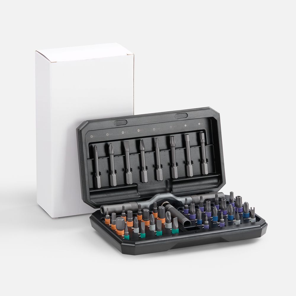 Fix Trix — это надежность в каждой детали, а также высокая точность и скорость работы благодаря храповому механизму отвертки и магнитным держателям для бит. Этот компактный набор для точной работы с электроникой и сборки оборудования подойдет как любителям, так и профессионалам. Набор Fix Trix отличается универсальностью: это самые востребованные типы бит в одном кейсе. Разборная отвертка с храповым механизмом особенно удобна для работы в труднодоступных местах. За счет обратного хода она снижает нагрузку на руку, а три магнитных держателя позволяют быстро менять биты без потери времени. Стильный и удобный кейс из ударопрочного пластика идеален для нанесения, поэтому набор Fix Trix всегда готов как к ежедневным задачам, так и к брендированию. Fix Trix — там, где важна точность.В комплекте реверсивная отвертка с трещоткой, состоящая из реверсивной основы, трех съемных магнитных держателей и 40 бит:Короткие (6,35х25 мм):Длинные (6,35х45 мм):