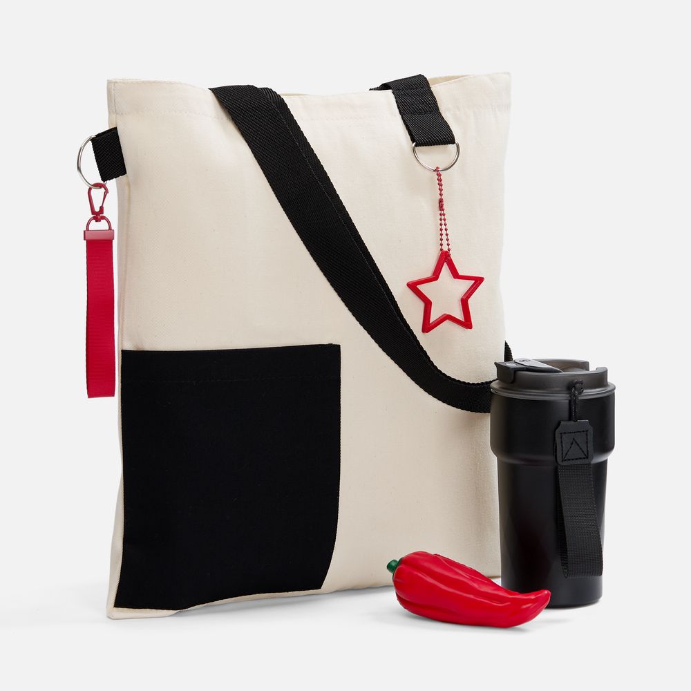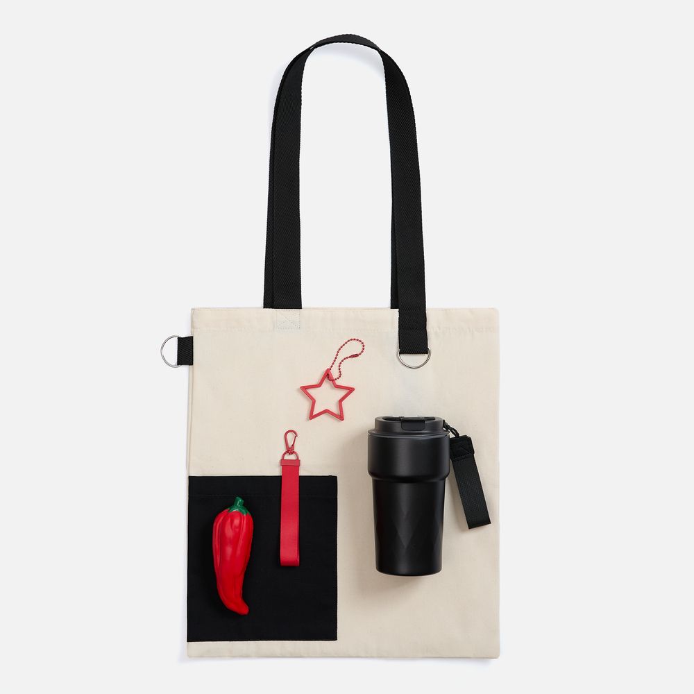 термостакан - металл, пластик; шопер - хлопок 100%, плотность 240 г/м²; саржа; сквиши-антистресс - полиуретан; подвеска - пластик; ремувка - полиэстер 100%, металл; цепочка - металл
