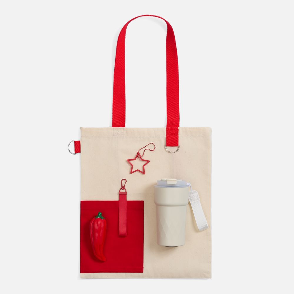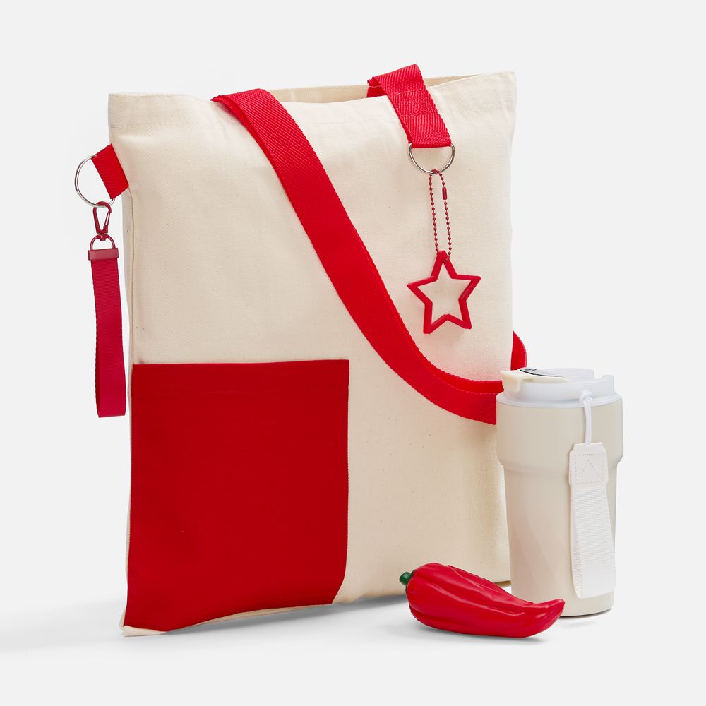 термостакан - металл, пластик; шопер - хлопок 100%, плотность 240 г/м²; саржа; сквиши-антистресс - полиуретан; подвеска - пластик; ремувка - полиэстер 100%, металл; цепочка - металл