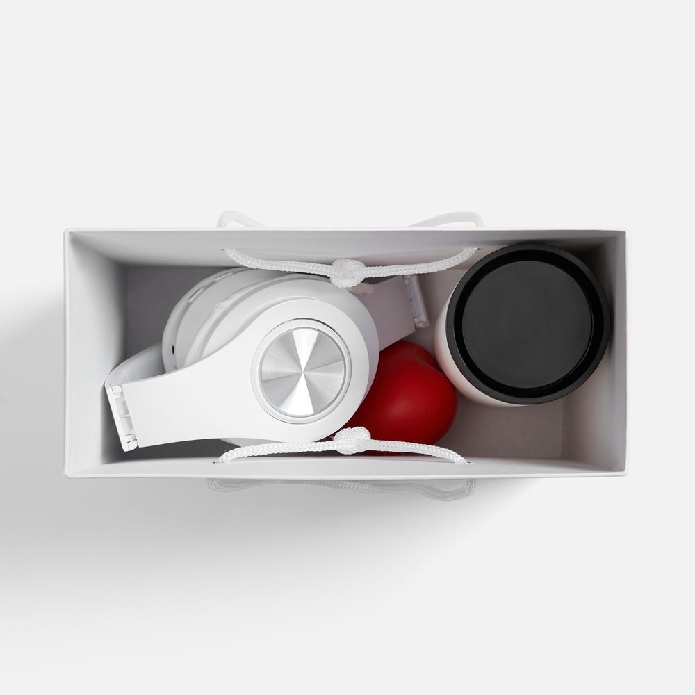 наушники - пластик; термостакан - нержавеющая сталь, матовое покрытие; крышка - пластик, силикон; коробка - переплетный картон, бумага Magic; антистресс - вспененный полиуретан
