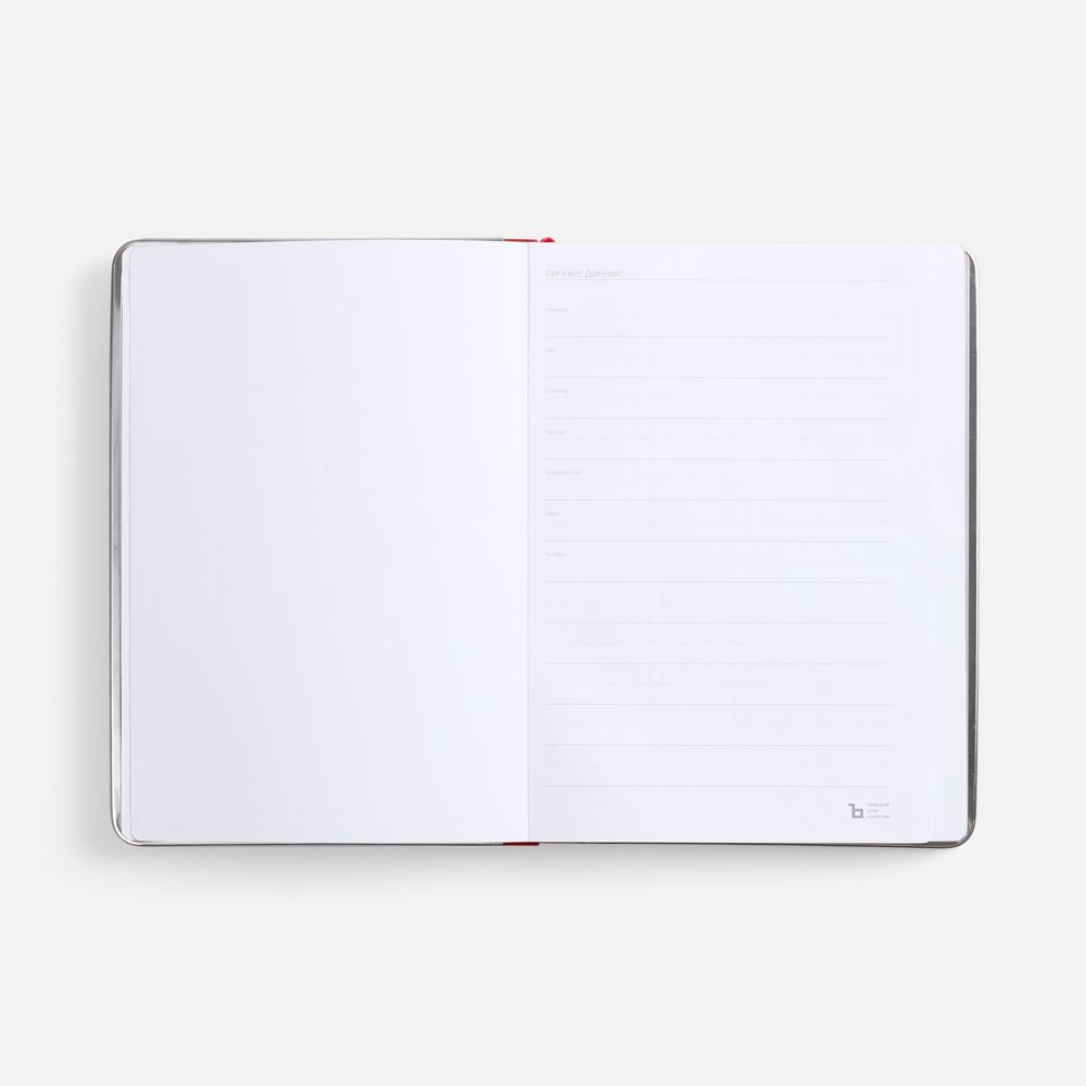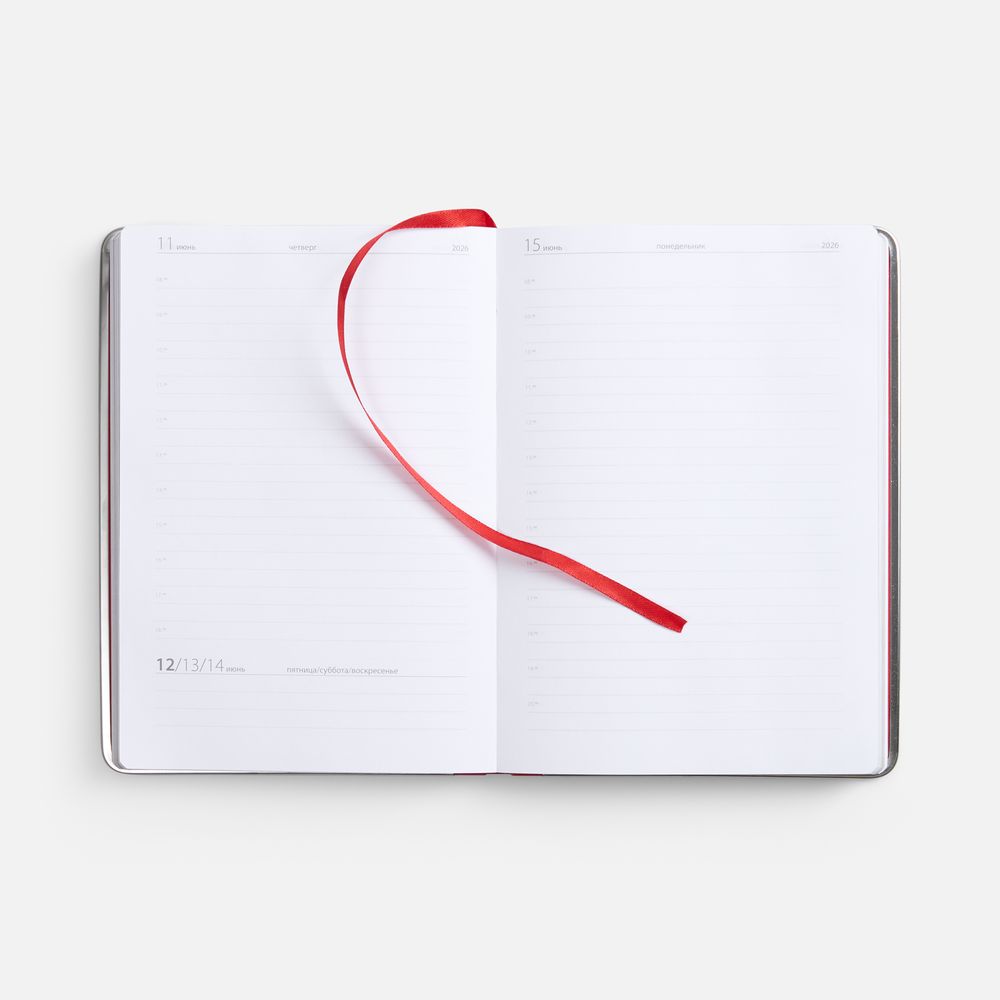 Ежедневник с твердой обложкой и серебристым обрезом блока. Выполнен из материала Nubuck, красный РР, дополнен красным ляссе и металлическими рамками с двух сторон обложки.Блок 256: