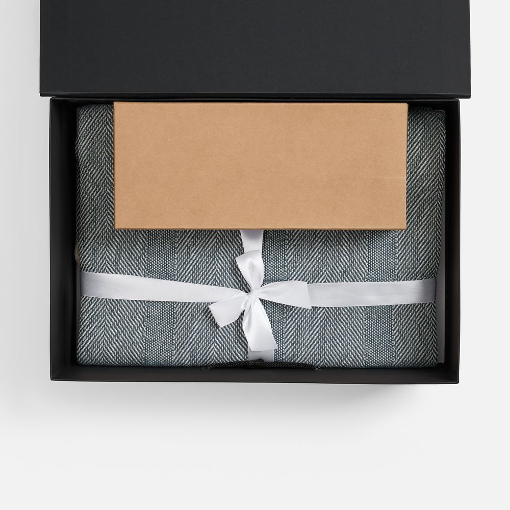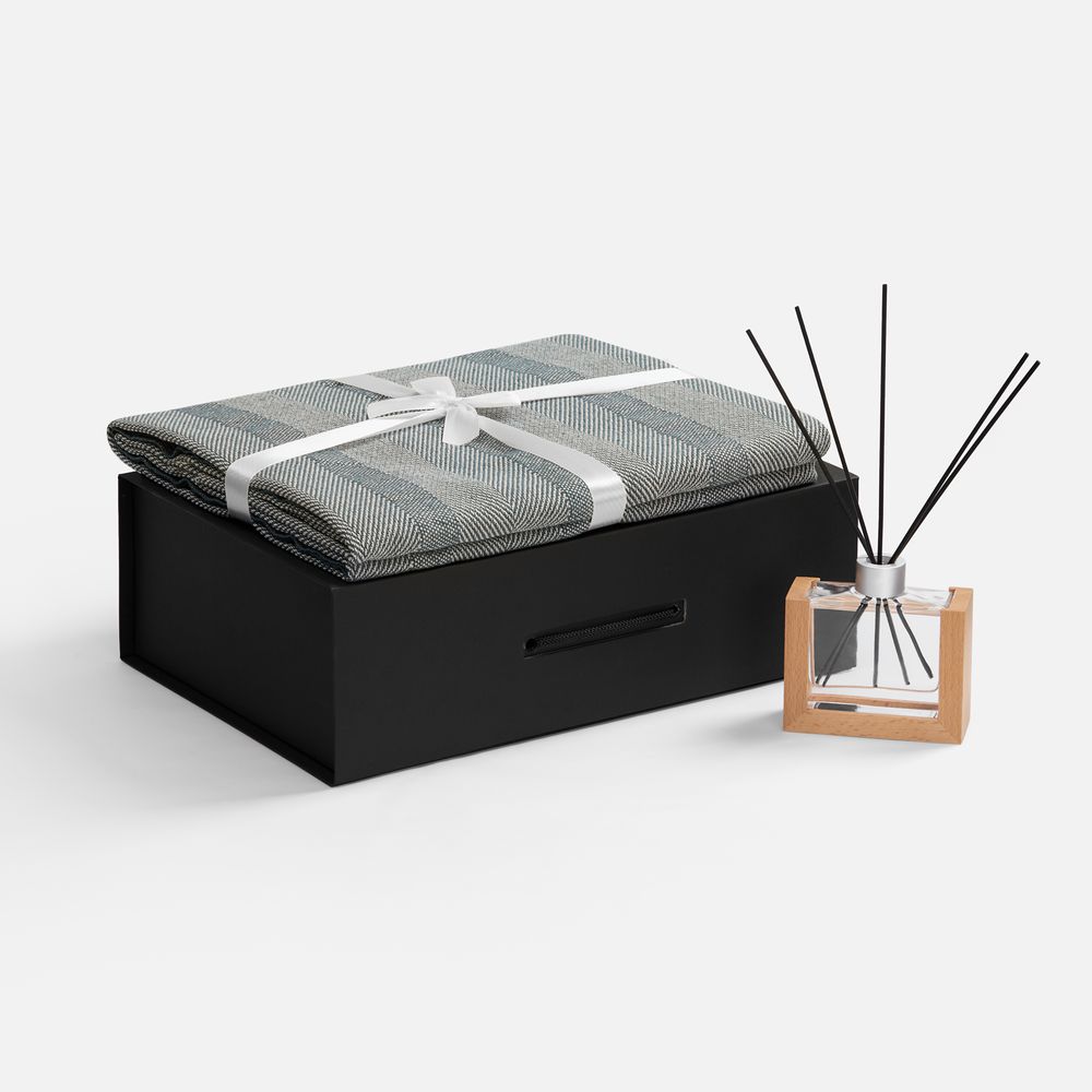 флакон - стекло, палочки из файбера; подставка для флакона - дерево; плед - хлопок 95%, полиэстер 5%, плотность 300 г/м²; коробка - переплетный картон, бумага Malmero