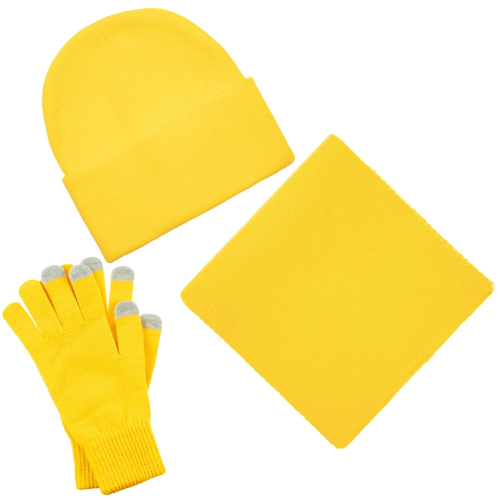 В комплект входят двухслойная шапка с регулируемым отворотом и легкий однослойный шарф из мягкой акриловой пряжи, сохраняющие тепло и защищающие от ветра, а также эргономичные перчатки со специальными токопроводящими волокнами на кончиках пальцев, в которых можно свободно пользоваться смартфоном даже в холодную погоду. Универсальная цветовая гамма и лаконичный дизайн делают набор органичным дополнением к любой верхней одежде. Набор поставляется в коробке с возможностью полной запечатки — идеальное решение для корпоративных подарков и промоакций.