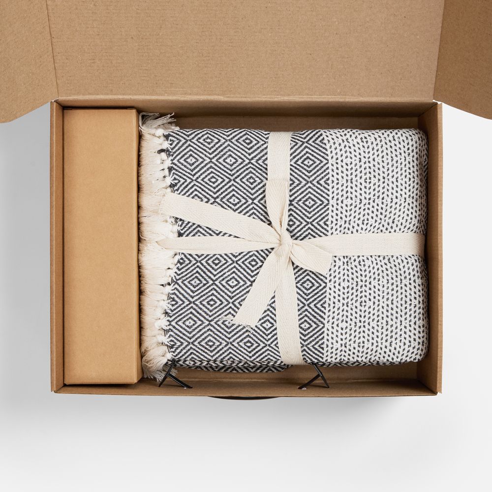 плед - хлопок 80%, полиэстер 20%, плотность 260 г/м²; флакон - стекло, палочки - дерево; коробка - микрогофрокартон