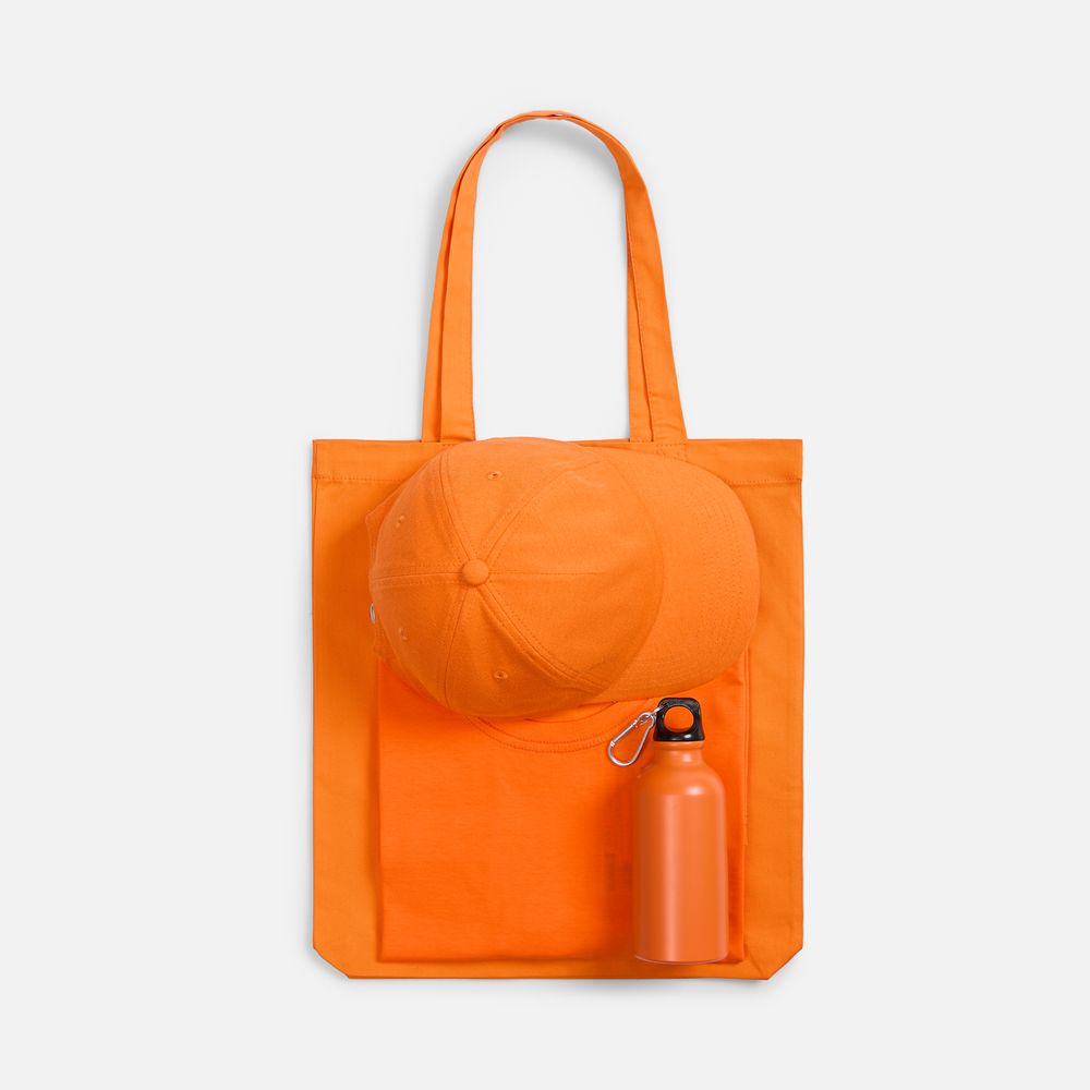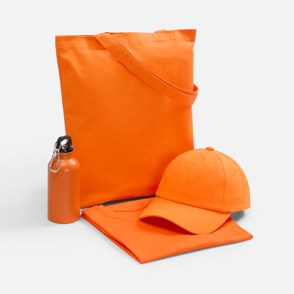 футболка - хлопок 100%, гребенная пряжа (пенье), плотность 160 г/м²; джерси; бейсболка - полиэстер, 75%; хлопок, 25%, плотность 170 г/м²; джерси; бутылка - алюминий; крышка - пластик; сумка - хлопок 100%, плотность 220 г/м²; саржа